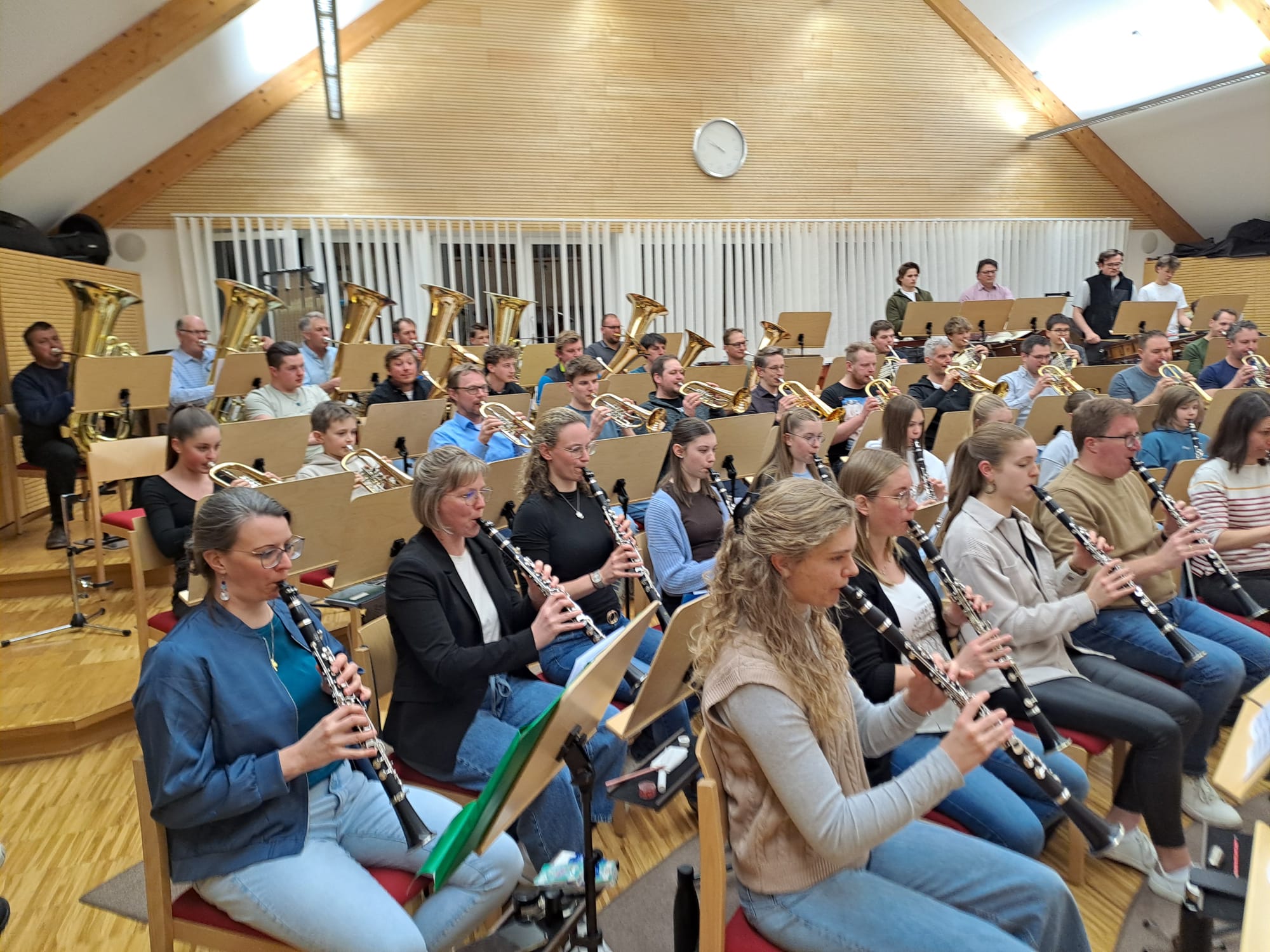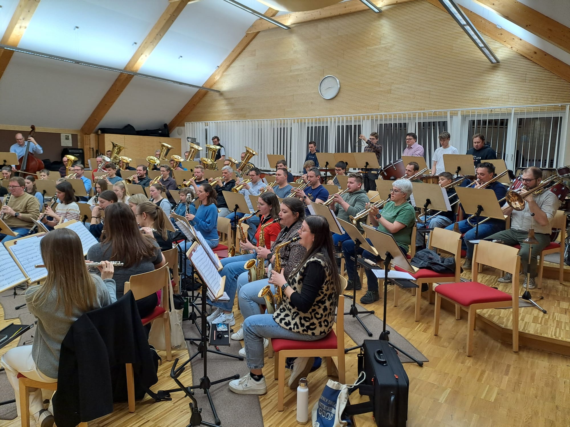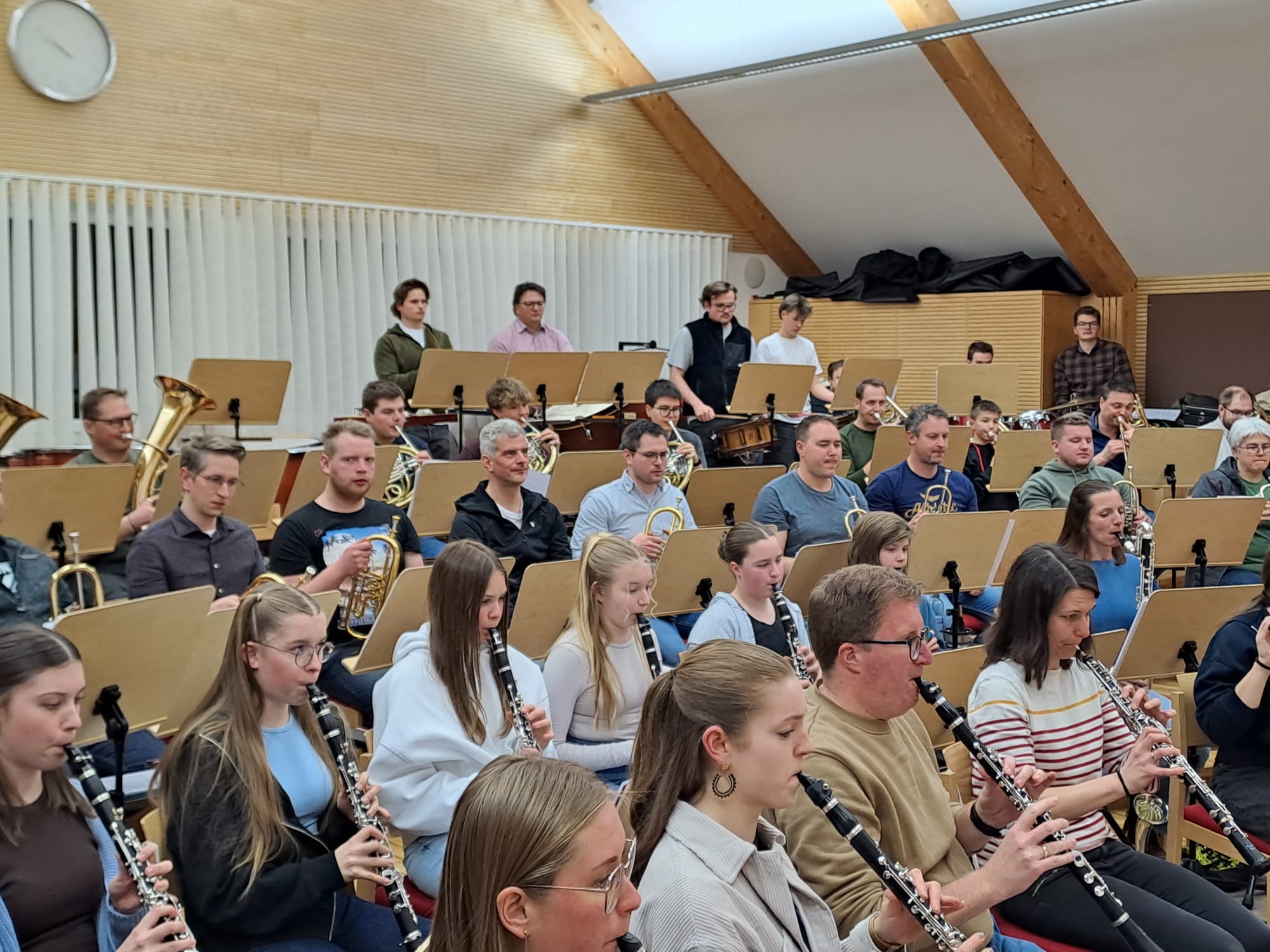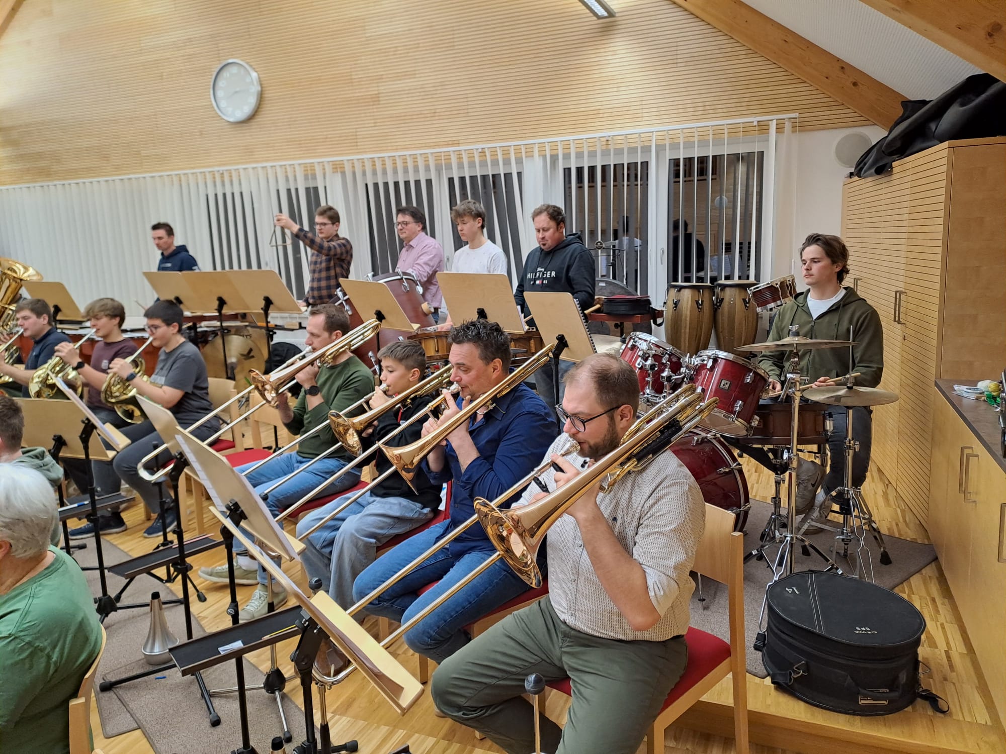 Der Nachmittag begann mit Registerproben, die von externen Musikern geleitet wurden. Dabei arbeiteten die einzelnen Gruppen – Schlagwerk, hohes Blech, Posaunen, Hörner und Saxofone – gezielt an Klang, Technik und Zusammenspiel. Diese intensive Arbeit im kleinen Rahmen brachte viele wertvolle Impulse für die weitere Probenarbeit.