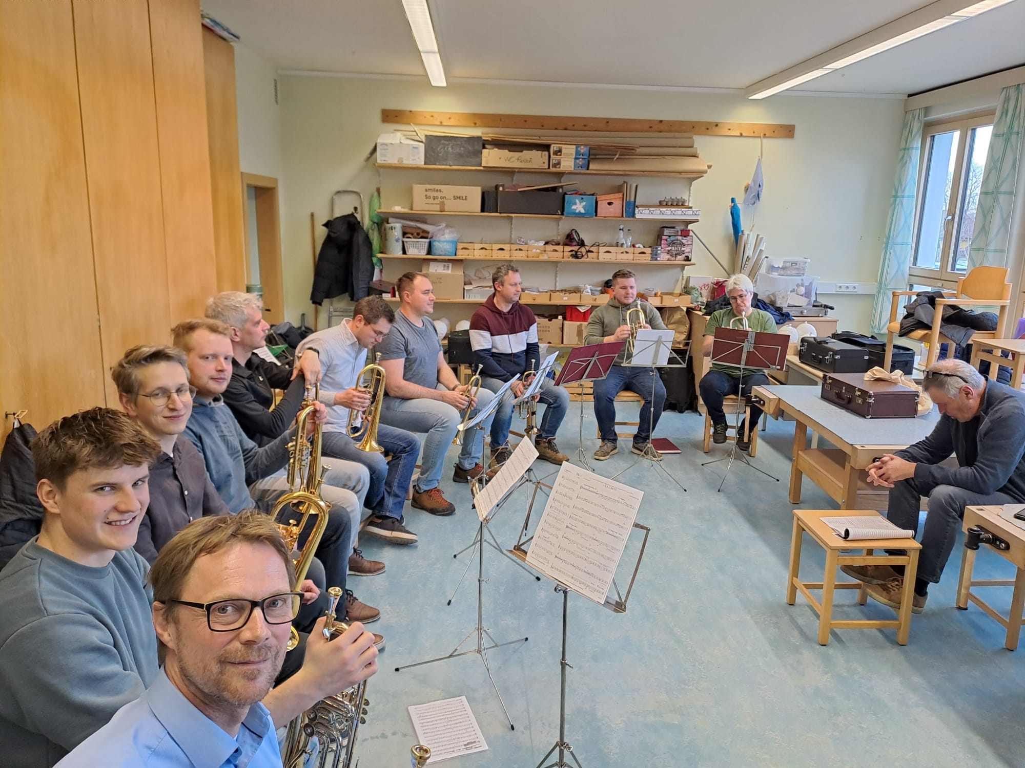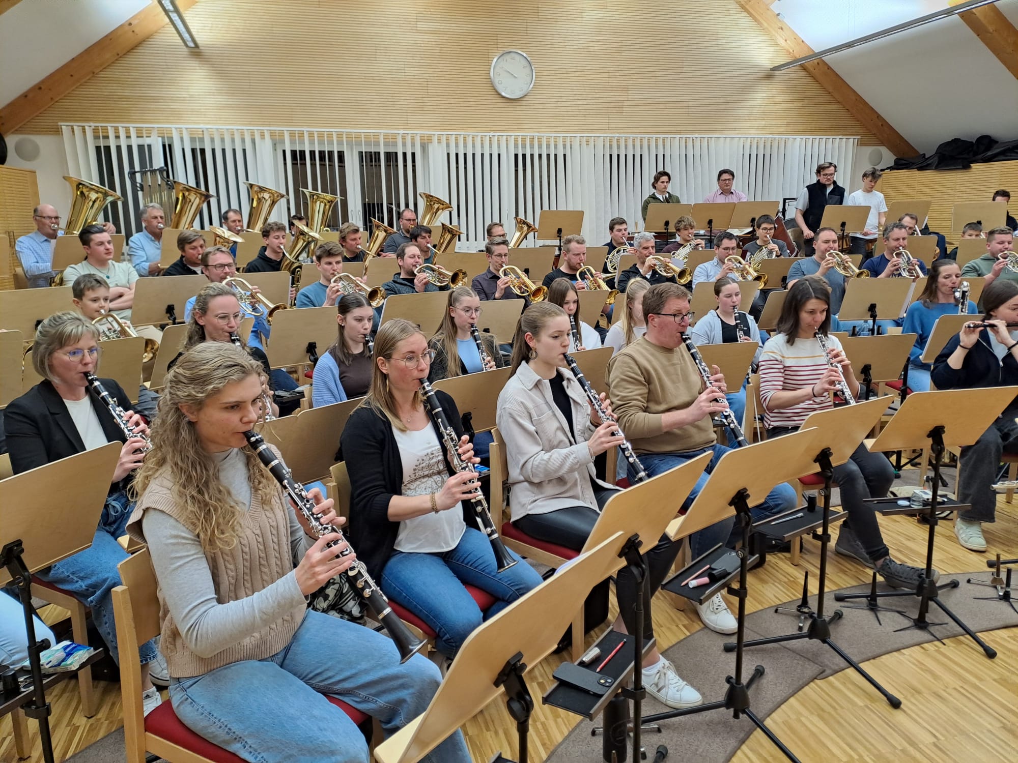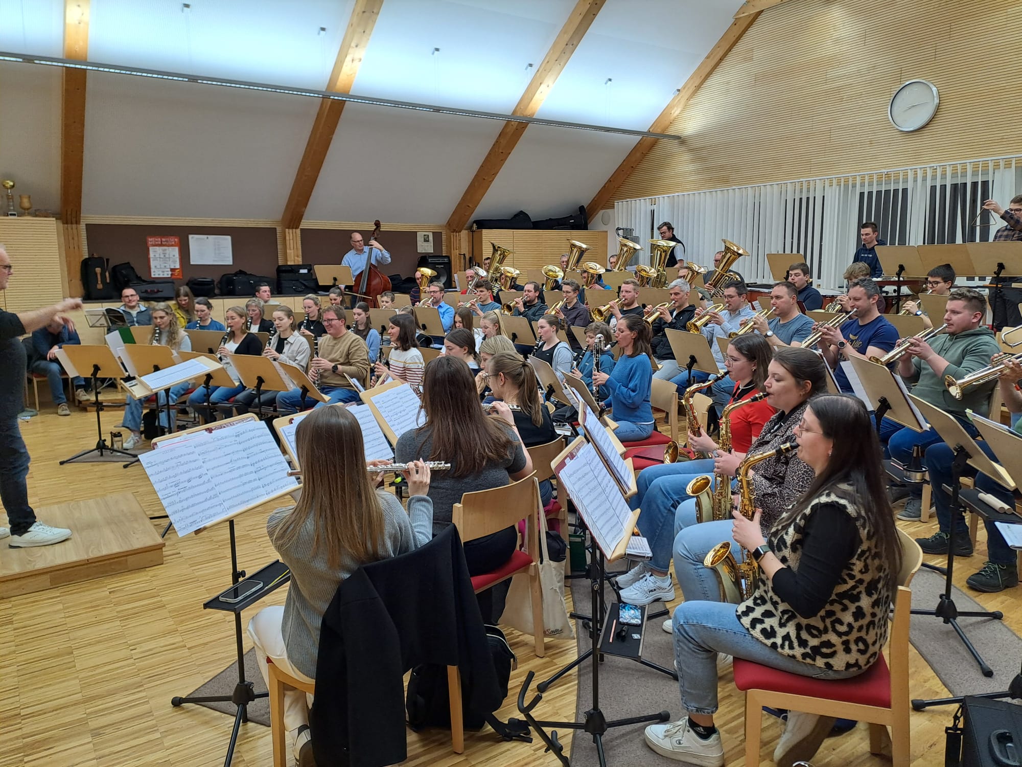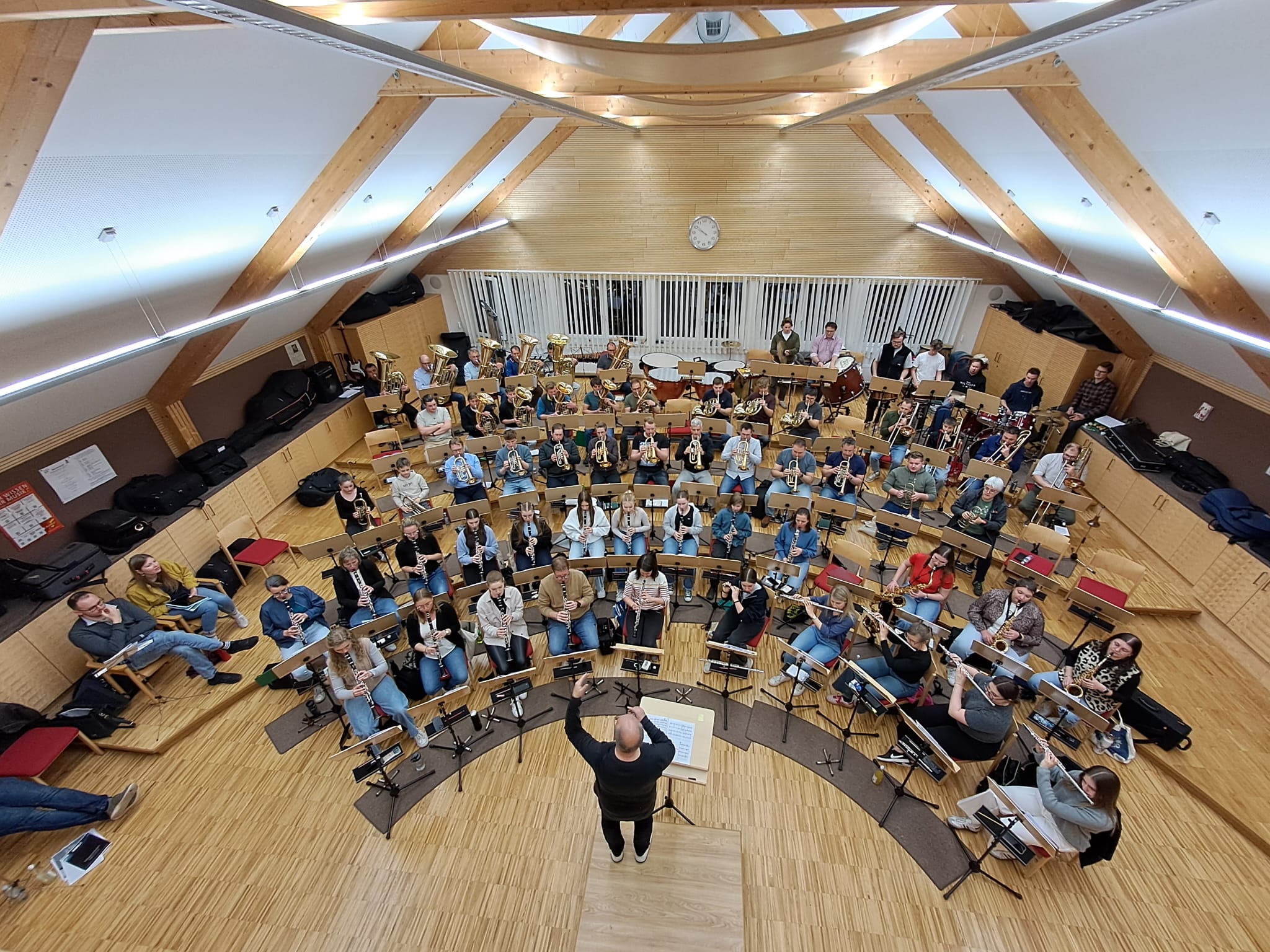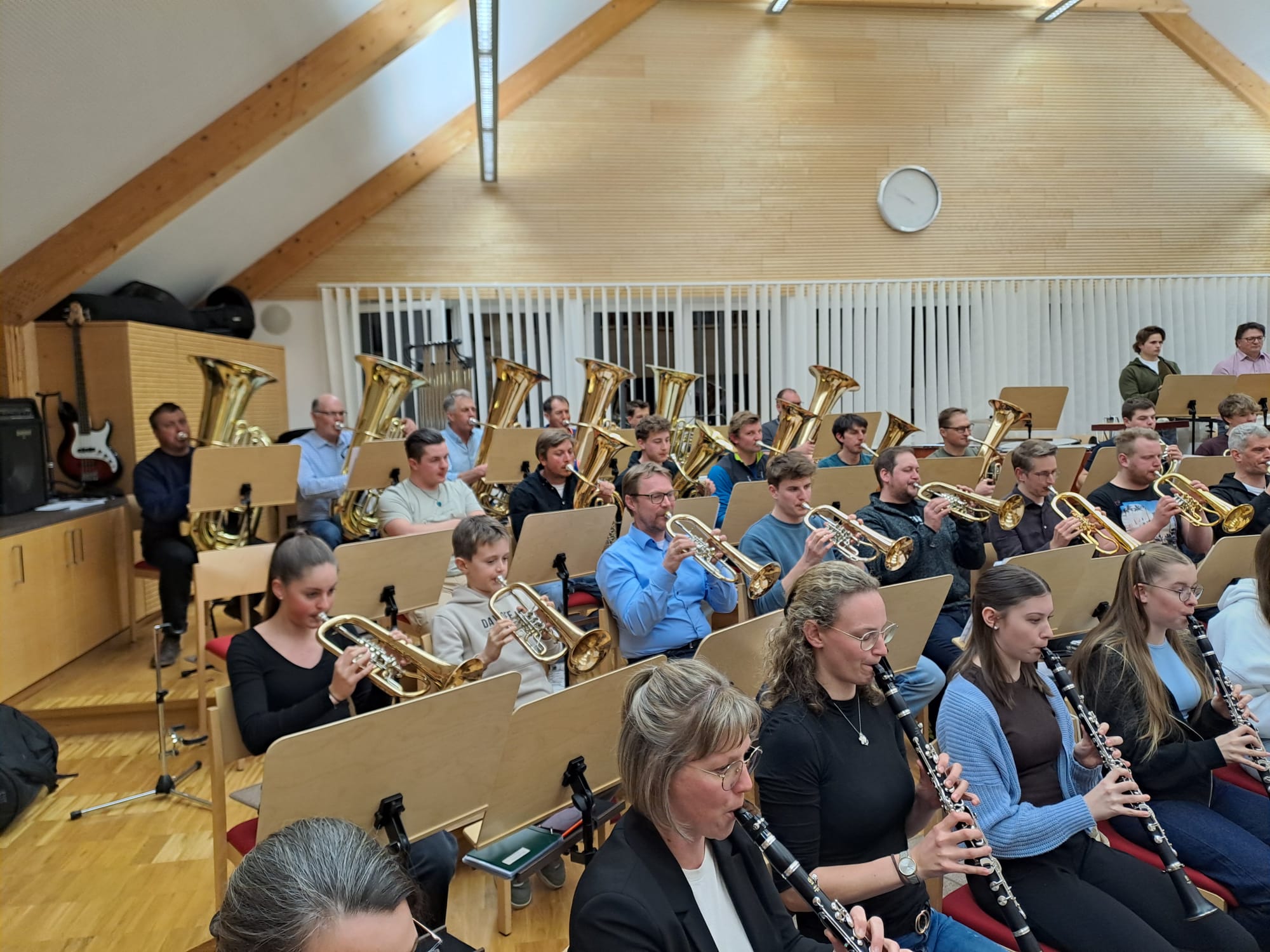 Der Nachmittag begann mit Registerproben, die von externen Musikern geleitet wurden. Dabei arbeiteten die einzelnen Gruppen – Schlagwerk, hohes Blech, Posaunen, Hörner und Saxofone – gezielt an Klang, Technik und Zusammenspiel. Diese intensive Arbeit im kleinen Rahmen brachte viele wertvolle Impulse für die weitere Probenarbeit.