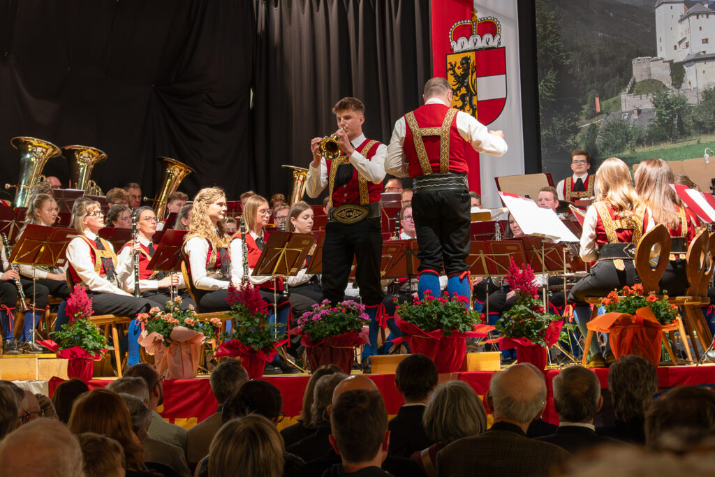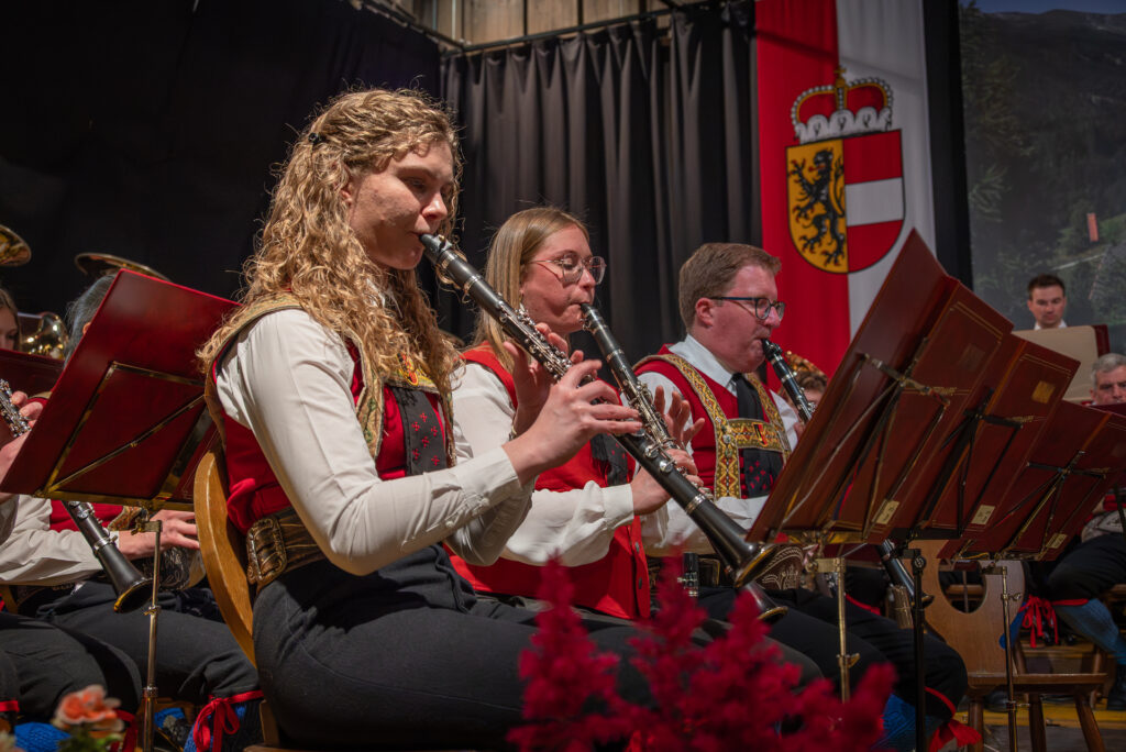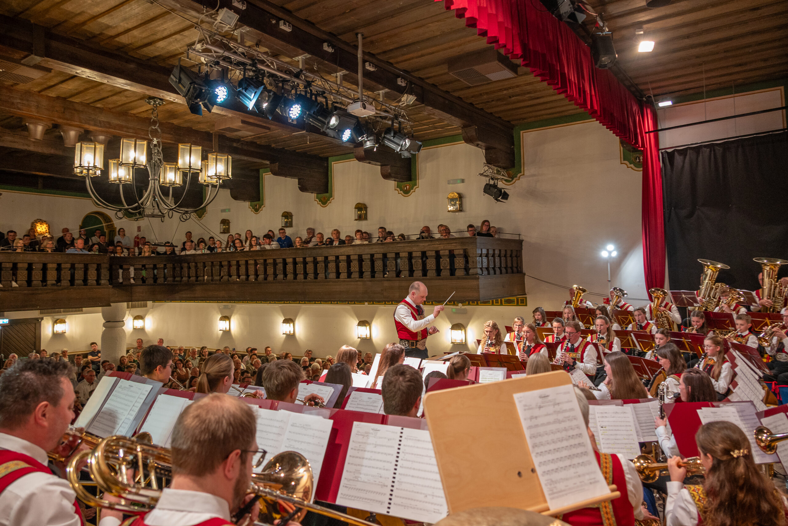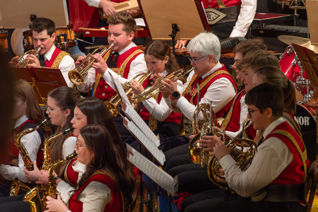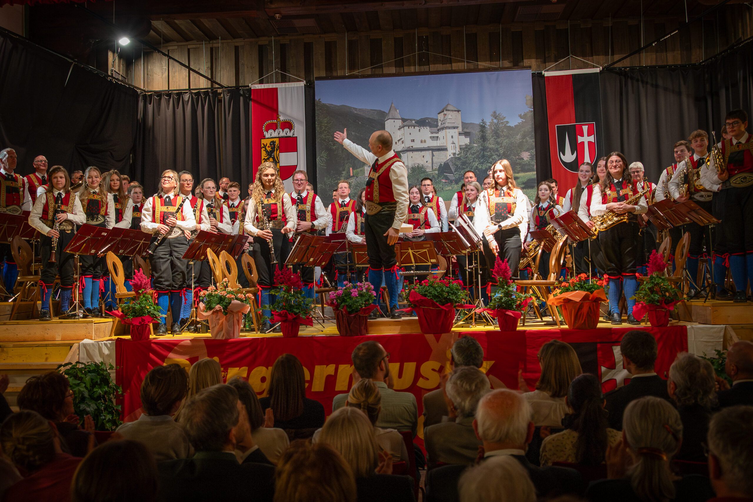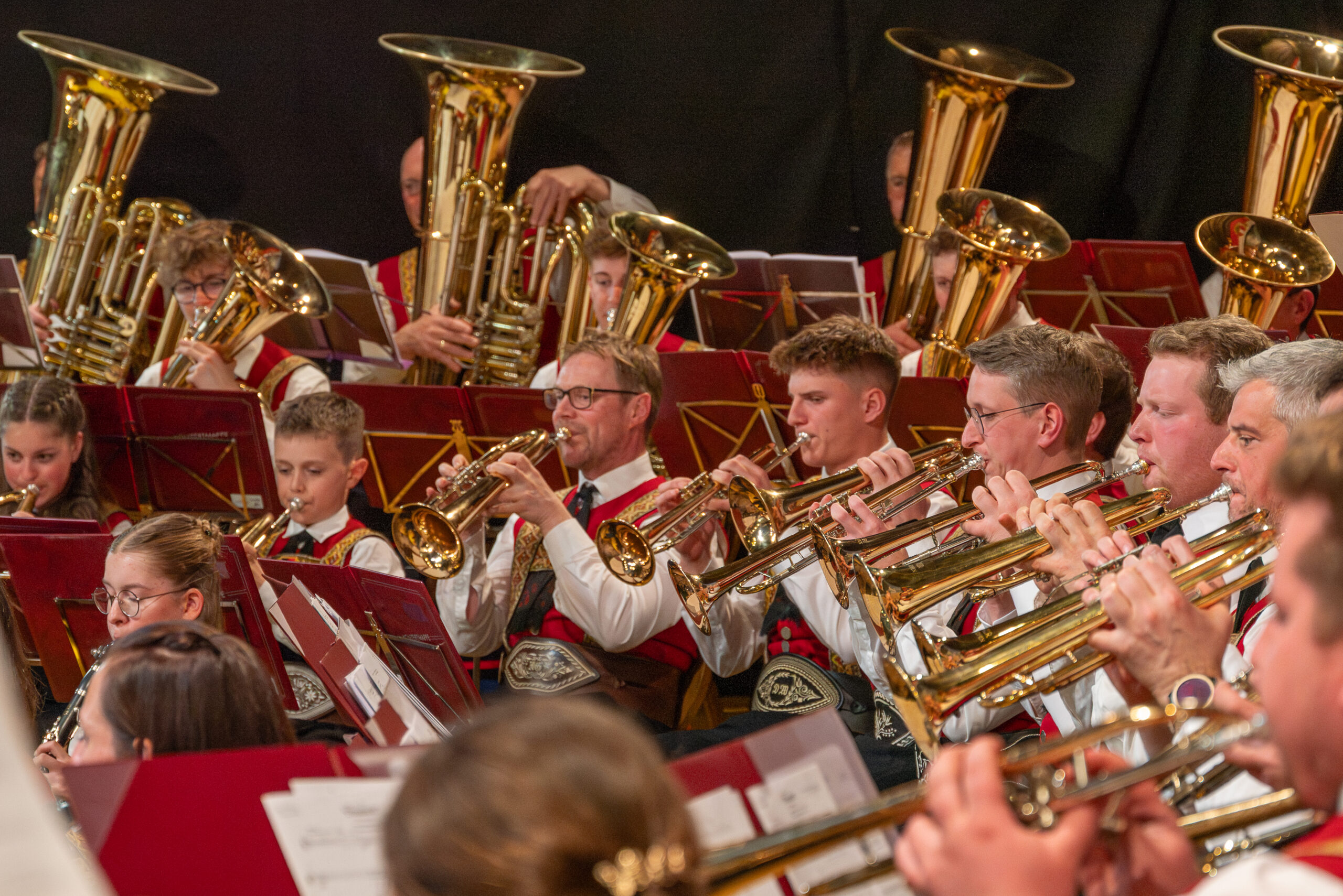 Kapellmeister Günther Binggl eröffnete den Konzertteil der Bürgermusik mit dem Konzertmarsch „Bergwelt“, gefolgt vom eindrucksvollen Konzertwerk „Terra di Montagne – Land der Berge“. Im weiteren Verlauf überzeugten wir mit einem abwechslungsreichen Programm, das Tradition und moderne Blasmusik vereinte. Ein besonderer Höhepunkt war das Solostück „Wenn die Augen glänzen“, bei dem unser Solist David Wieland mit musikalischem Feingefühl und technischer Brillanz begeisterte. Auch der Konzertwalzer „A la Carte“ sowie schwungvolle Stücke wie „Ein halbes Jahrhundert“ und „Full of Beans“ fanden großen Anklang beim Publikum, bevor mit der „Elisabeth“-Selection ein eindrucksvoller Schlusspunkt gesetzt wurde. Dank der Begeisterung des Publikums durften wir auch noch drei Zugaben spielen.